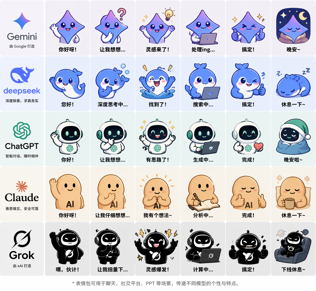 ▲提示词:生成一系列不同的 AI 大语言模型(Gemini、deepseek、ChatGPT、Claude、Grok 等)的表情包设计