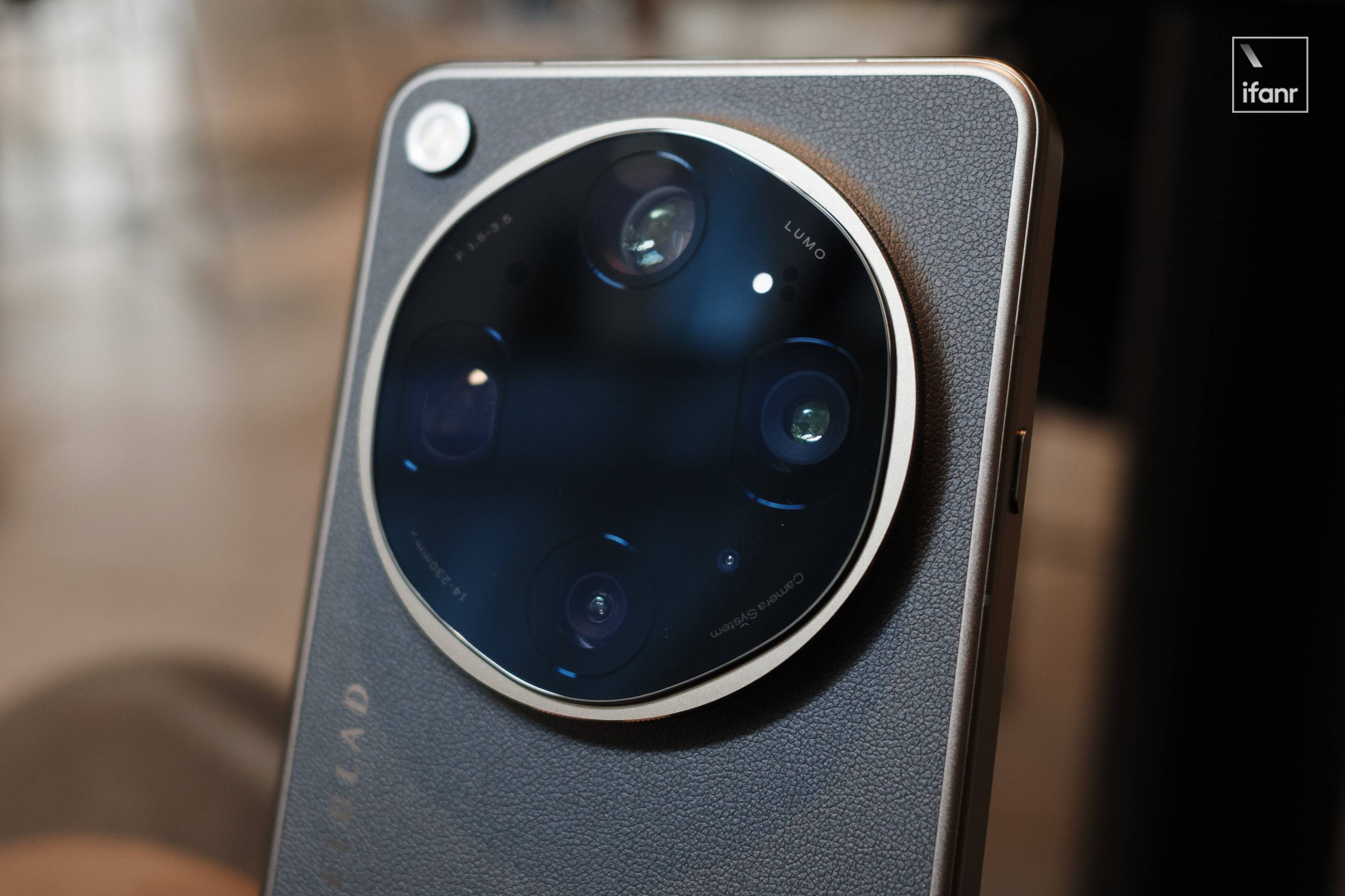 而大地苔原配色的背部被素皮一分为二,OPPO Logo 变为侧边纵置在底部皮革上,影像 Deco 中的「H」标志也移到素皮上扩展成 Hasselblad 全称,并与 OPPO Logo 对齐,像老式相机的铭牌一样纵向排布在侧边。